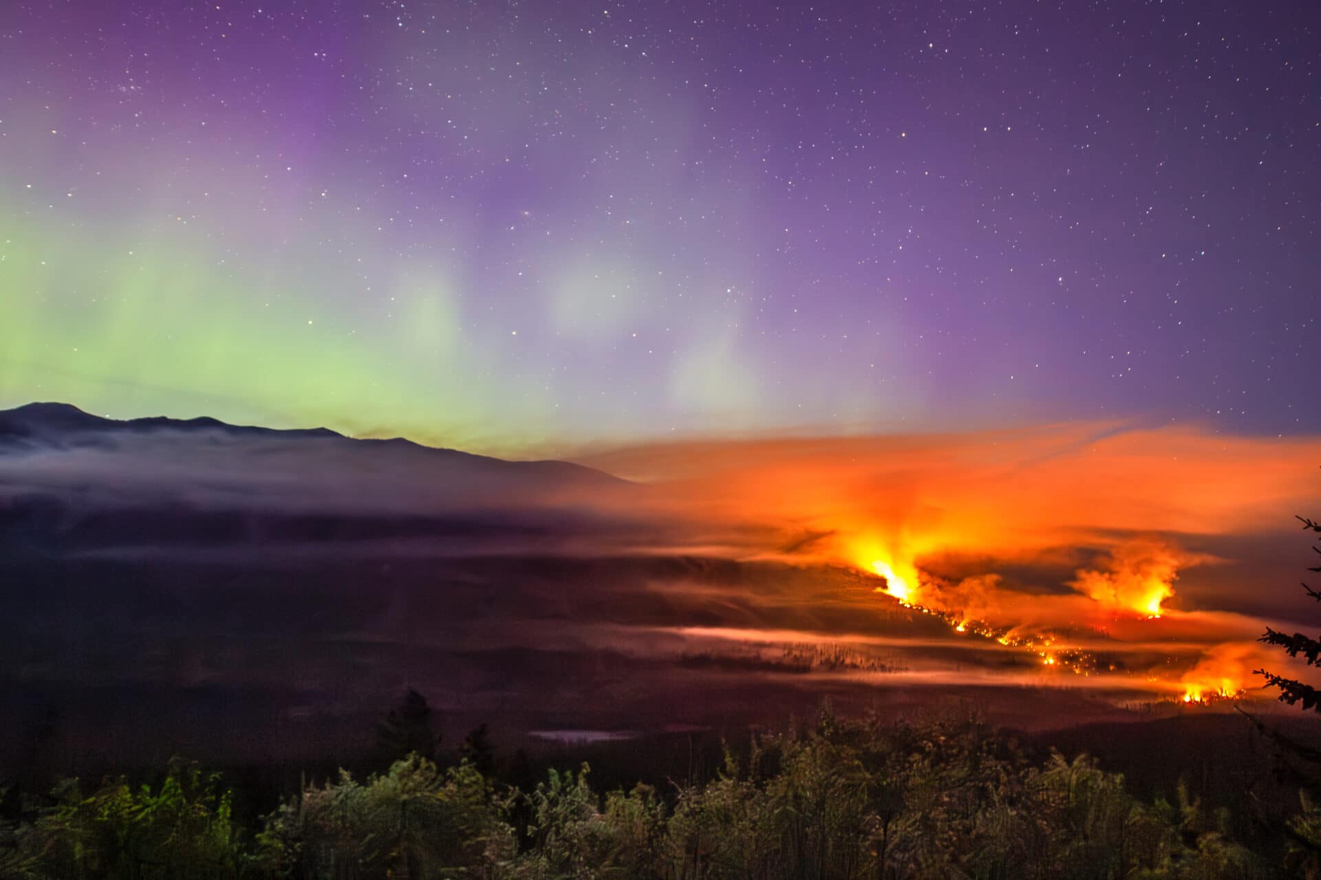 This image shows a wildfire backlit by the Aurora Borealis. The wildfire was burning on Mitchell Ridge in Kootenay National Park, British Columbia, Canada in May 2023.