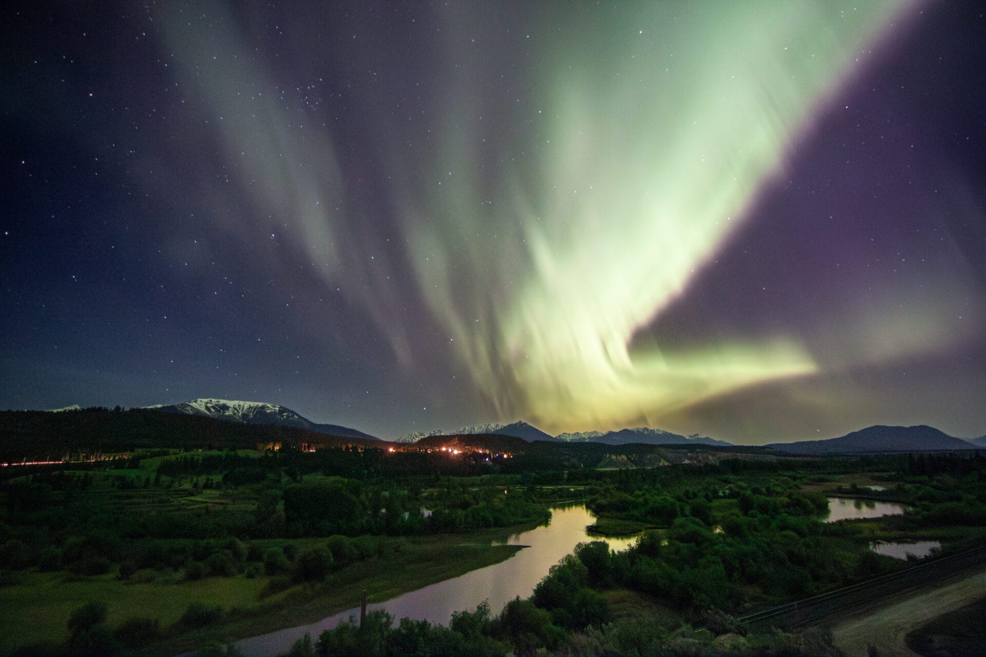 The Aurora Borealis over the Columbia Wetlands and the hamlet of Wilmer, British Columbia, Canada. Beyond are the snow-capped Purcell Mountains.
