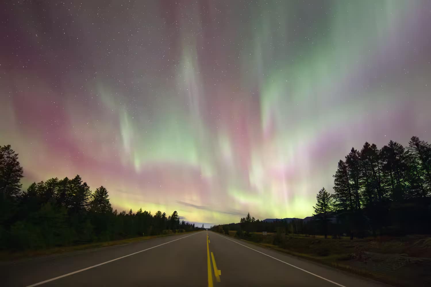 Highway 93/95 in the Columbia Valley, BC beneath the Aurora Borealis.
