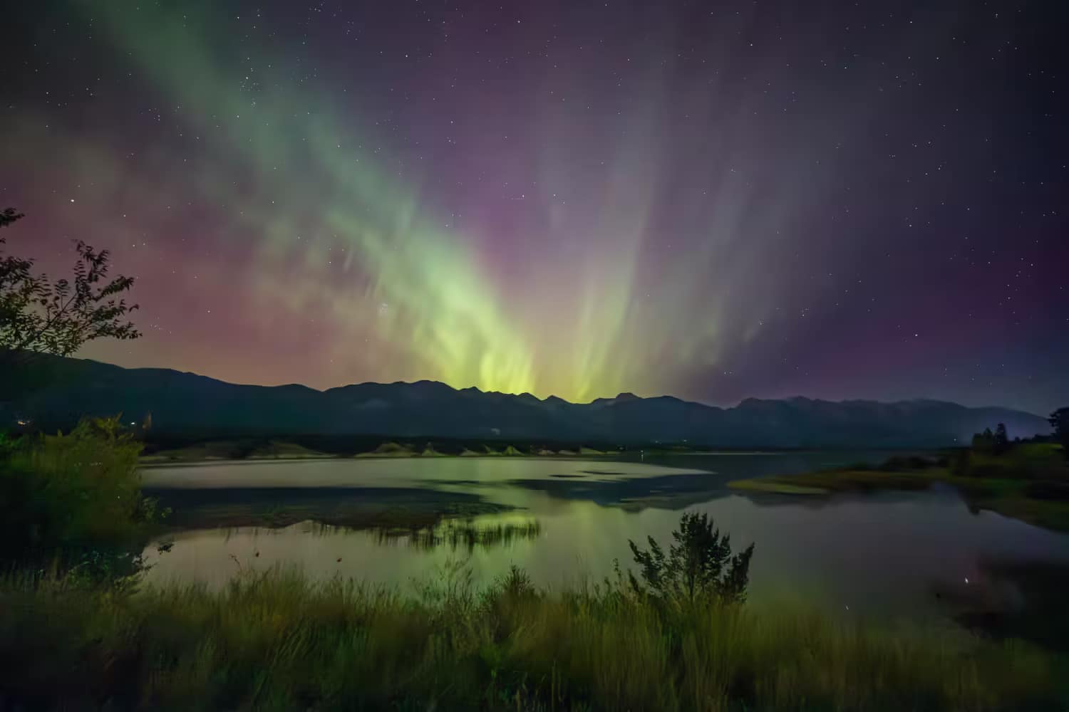 Lake Windermere and the Canadian Rockies with the Aurora Borealis overhead.