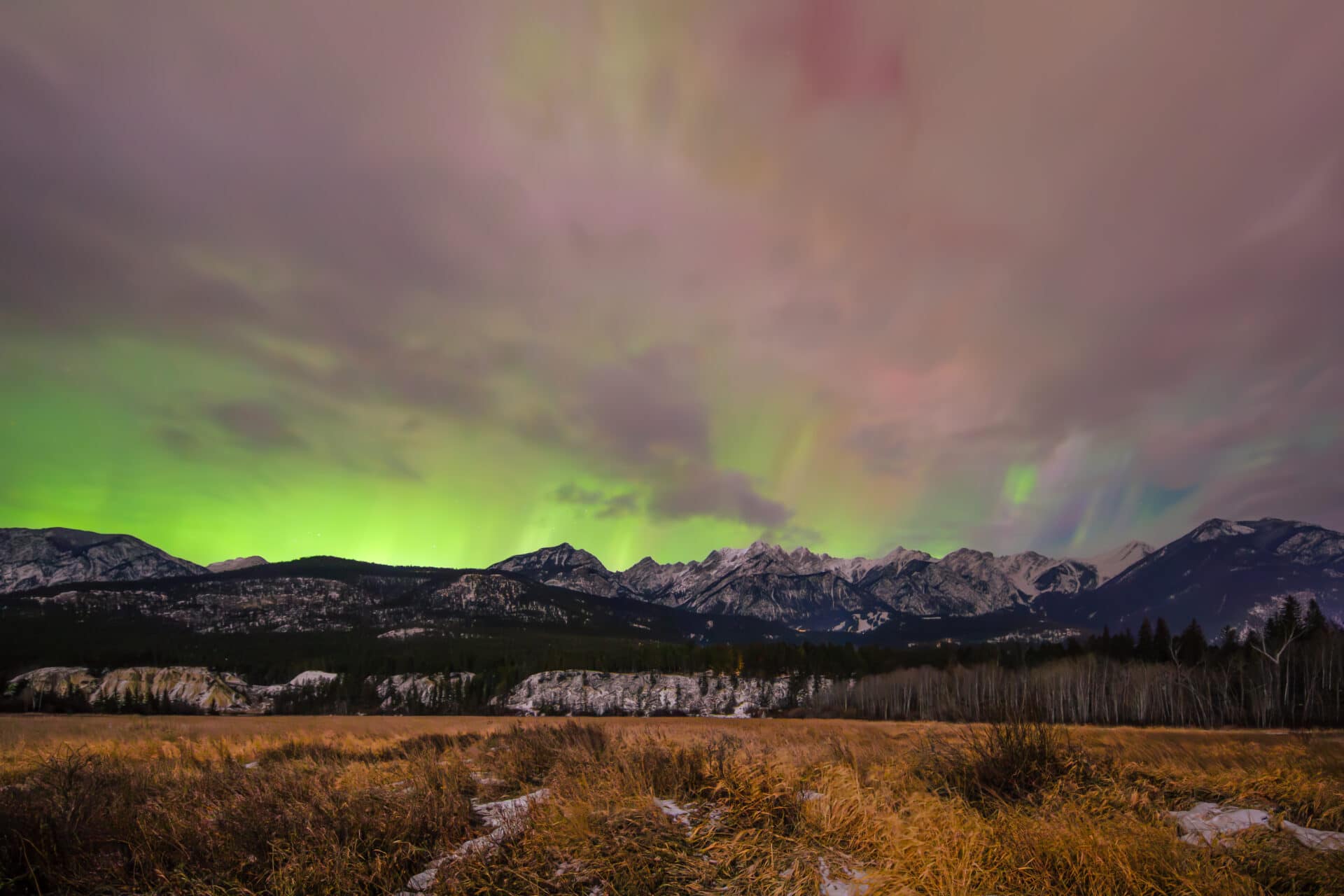 The Aurora Borealis backlights broken clouds and the Canadian Rockies at Fairmont Hot Springs, British Columbia, Canada.