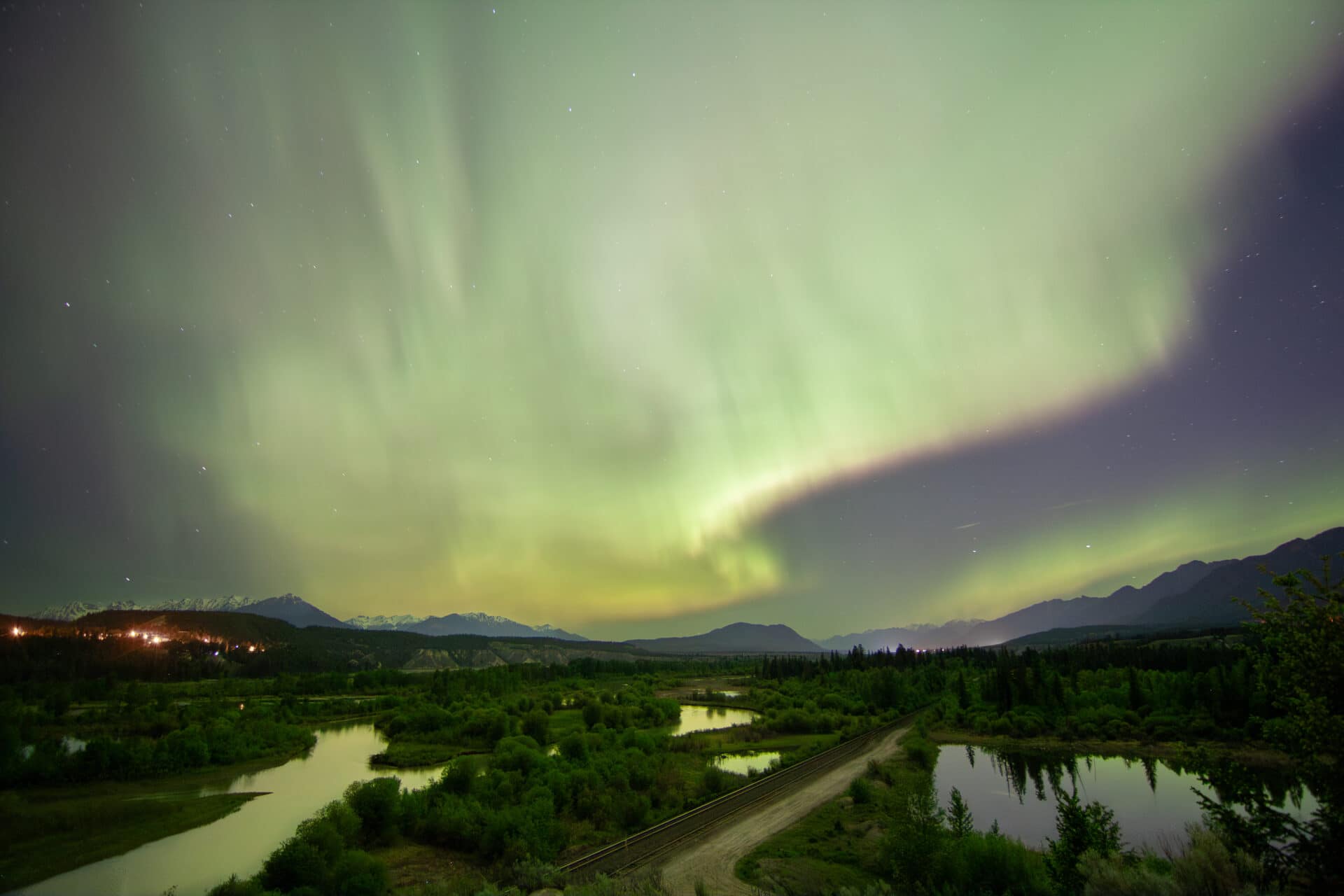 The Aurora Borealis over the Columbia Wetlands. The lights of Wilmer, BC, and the Purcell Mountains are on the left and the lights of Radium Hot Springs and the Canadian Rockies to the right.