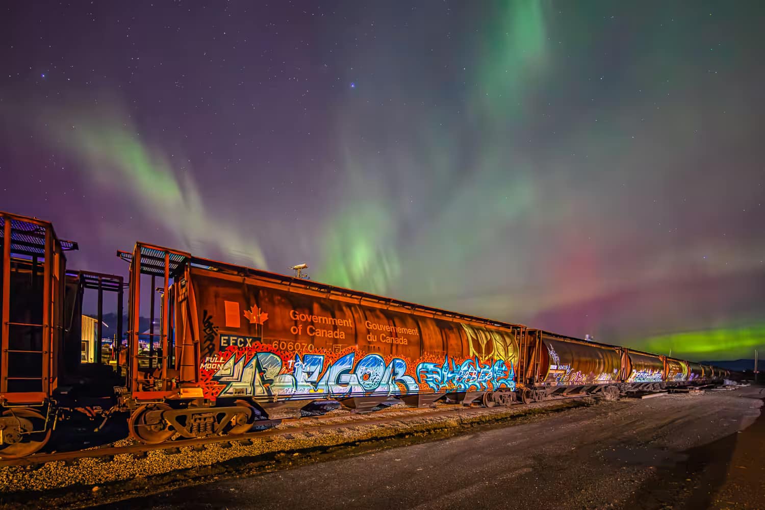 Train graffitti in the railyard at Invermere, BC beneath the Aurora Borealis.