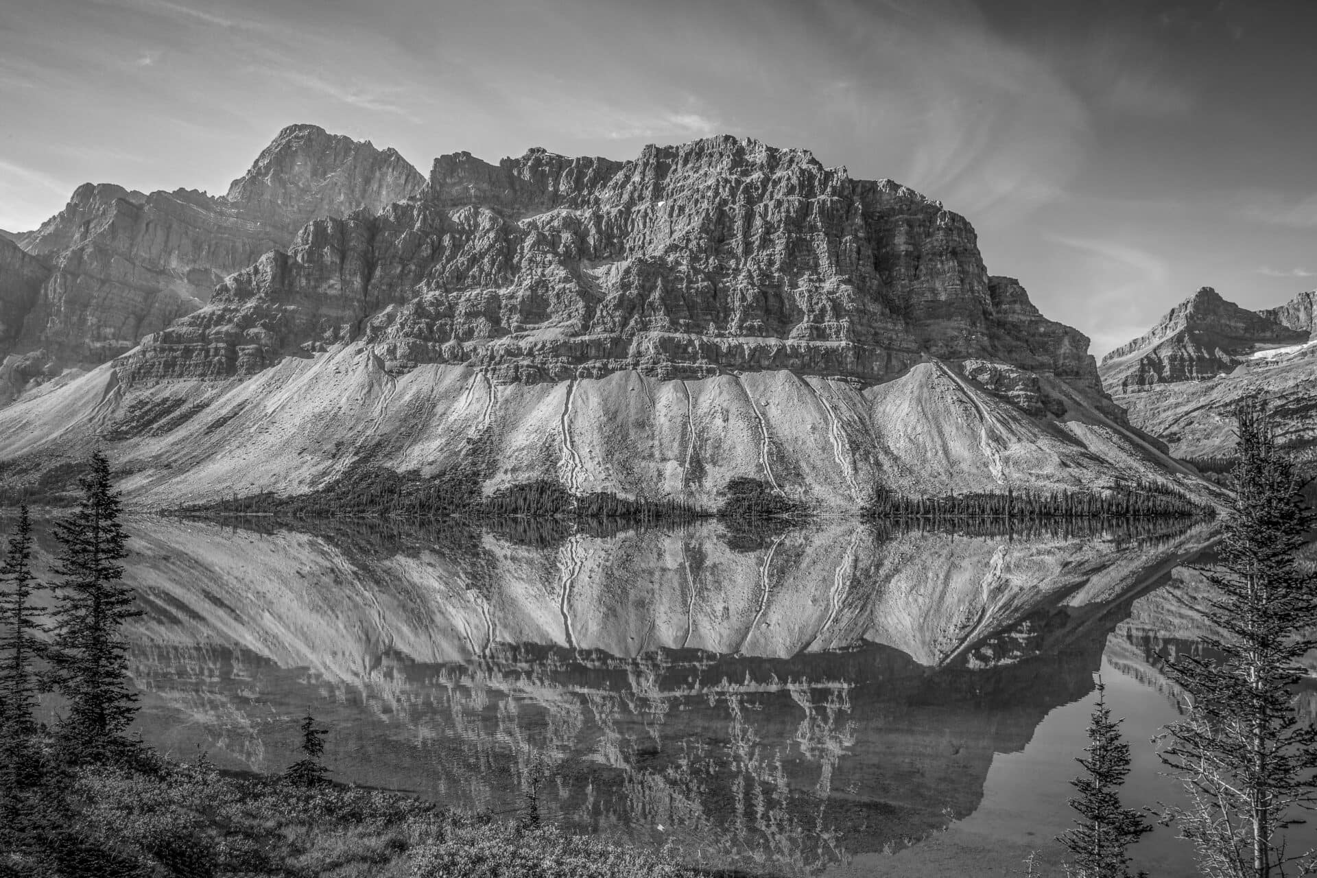 This black and white image shows the lower north flank of Crowfoot Mountain reflected in Bow Lake in Banff National Park, Alberta, Canada.