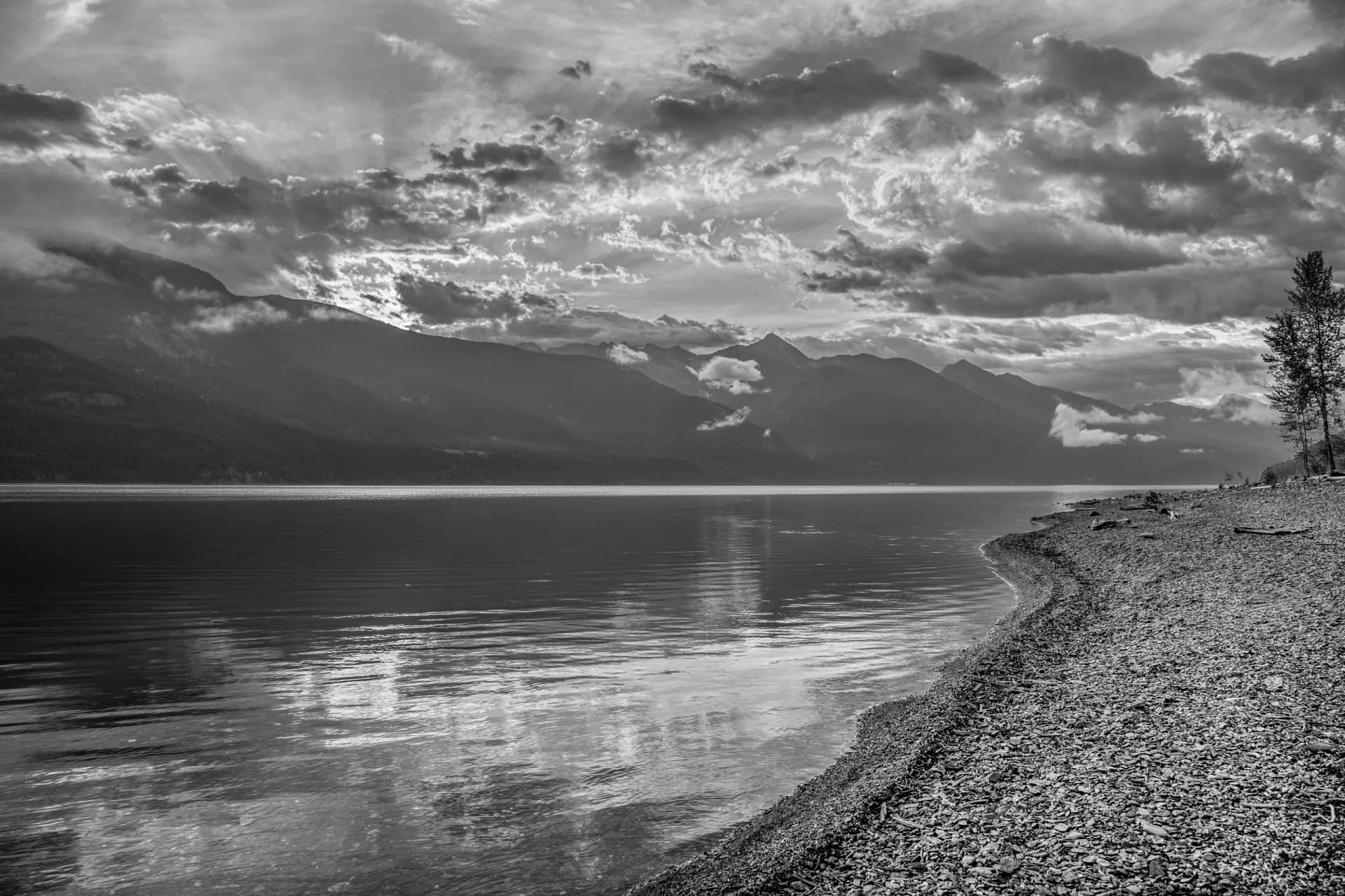 This black and white image shows the sunrise over the Purcell Mountains and Kootenay Lake in the West Kootenay region of British Columbia, Canada.