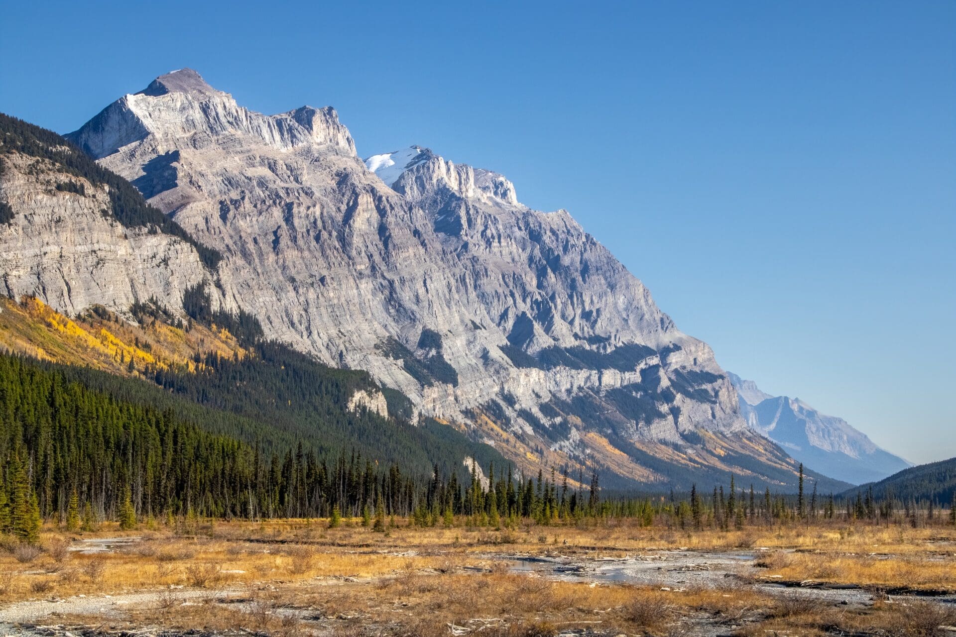 Mount Wilson (10,696′) towers over the North Saskatchewan River valley in Banff National Park, Alberta, Canada.