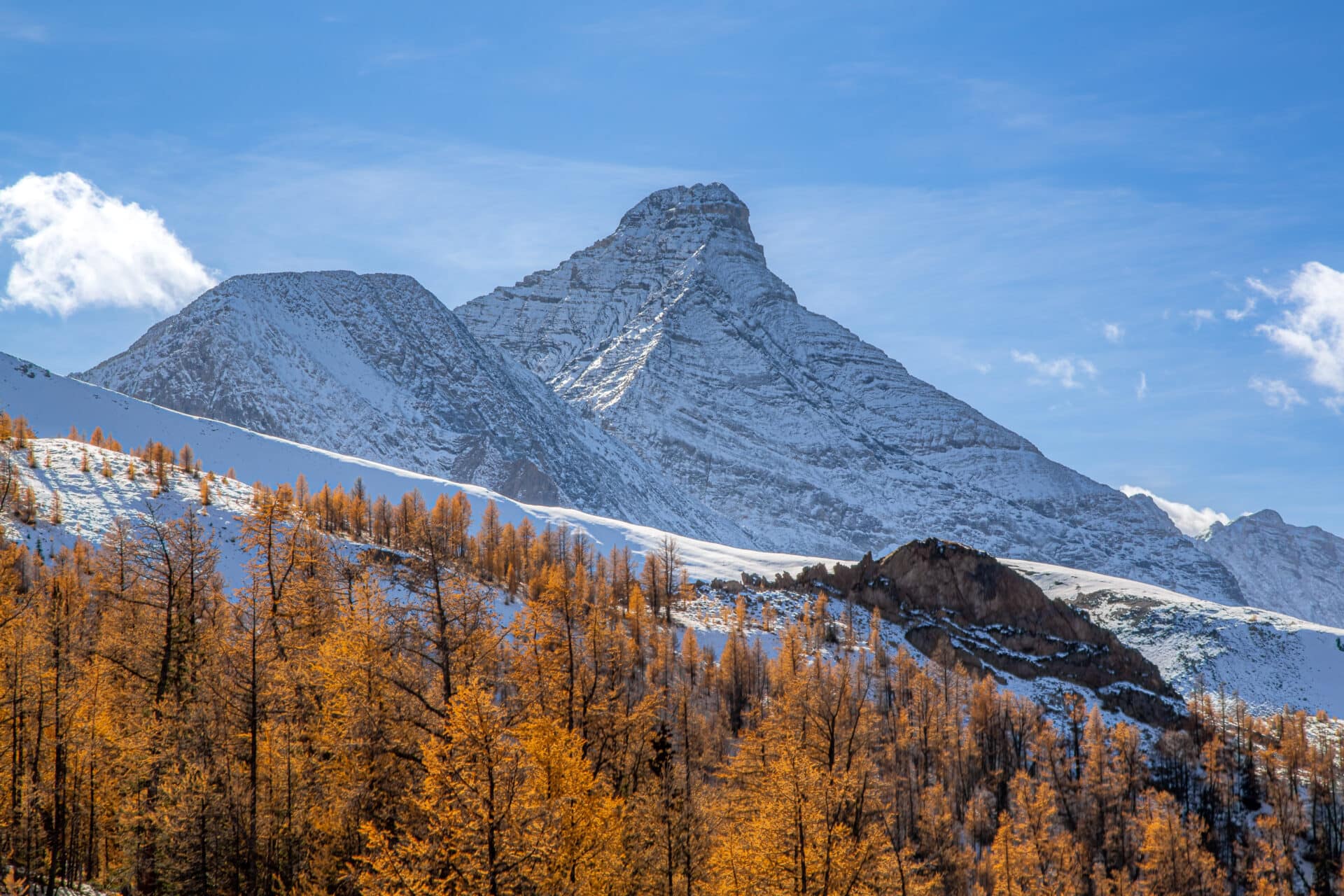 Golden Larches on Paradise Ridge with Mount Nelson and Mount Trafalgar in the background, near Panorama, British Columbia, Canada.